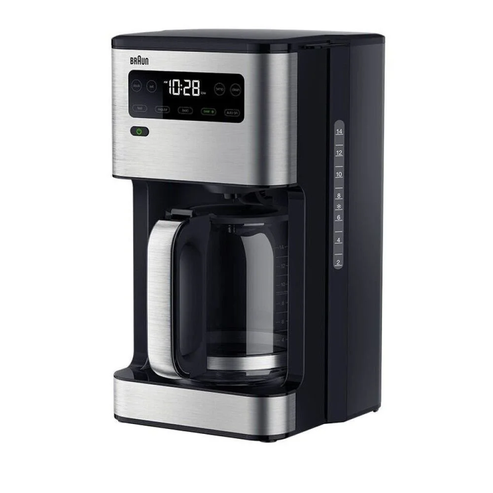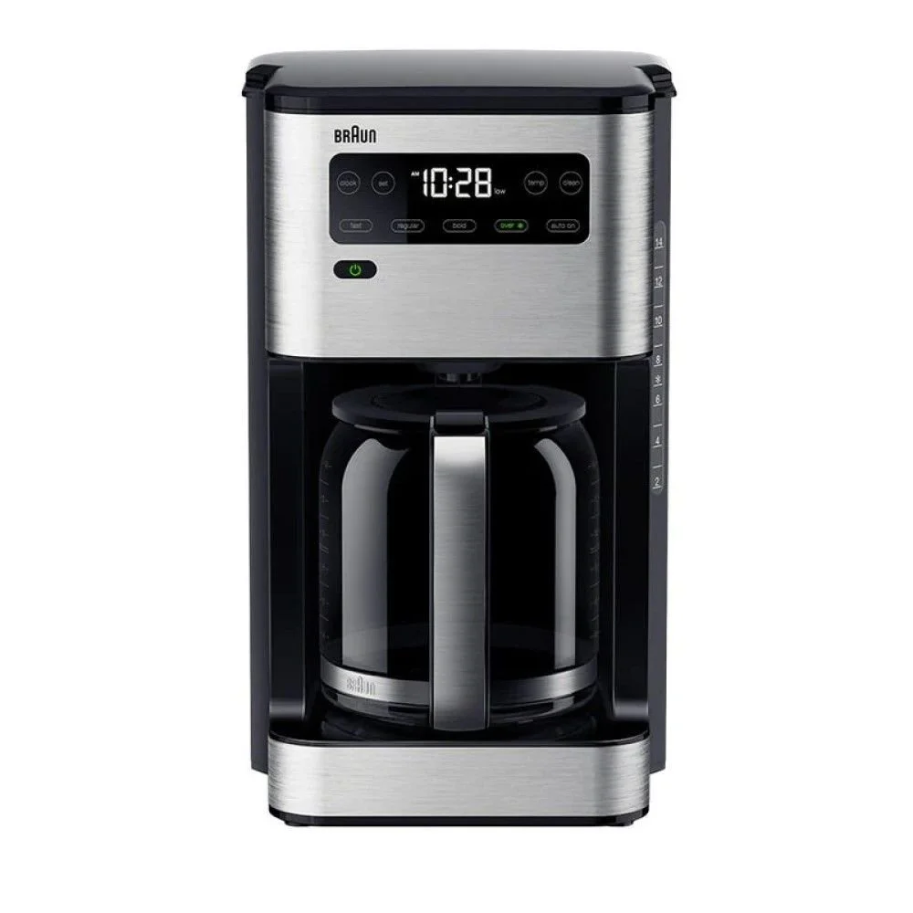 Start your mornings with a perfectly brewed cup of coffee that suits exactly your preferences with the Braun PureFlavor Coffee Maker! Featuring an intuitive display with a simplified touchscreen interface, this coffee maker allows for 24-hour customizable programming – making busy weekday mornings run smoother & leisurely weekend mornings all the more relaxing. With four brewing options, you can choose between Fast, Regular, Bold, or Over Ice. Equipped with PureFlavor technology, each brew will be perfectly extracted with preserved aromas and bold flavors, even when brewing over ice – ensuring no cup is ever watered down or lacking in flavor. The SteadyTemp warming plate keeps coffee at the ready for longer, with three heat settings that can be maintained for up to 4 hours. Finished in a sleek black plastic construction with stainless steel details in a compact design, this coffee maker makes a sophisticated statement on your countertop between uses while taking up minimal space. To simplify your mornings, prepare coffee with the Braun PureFlavor Coffee Maker!Ā