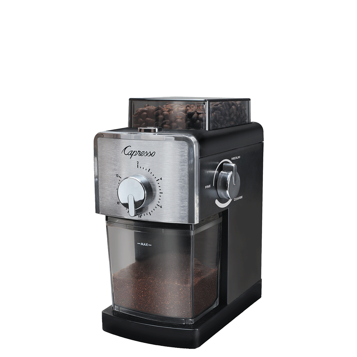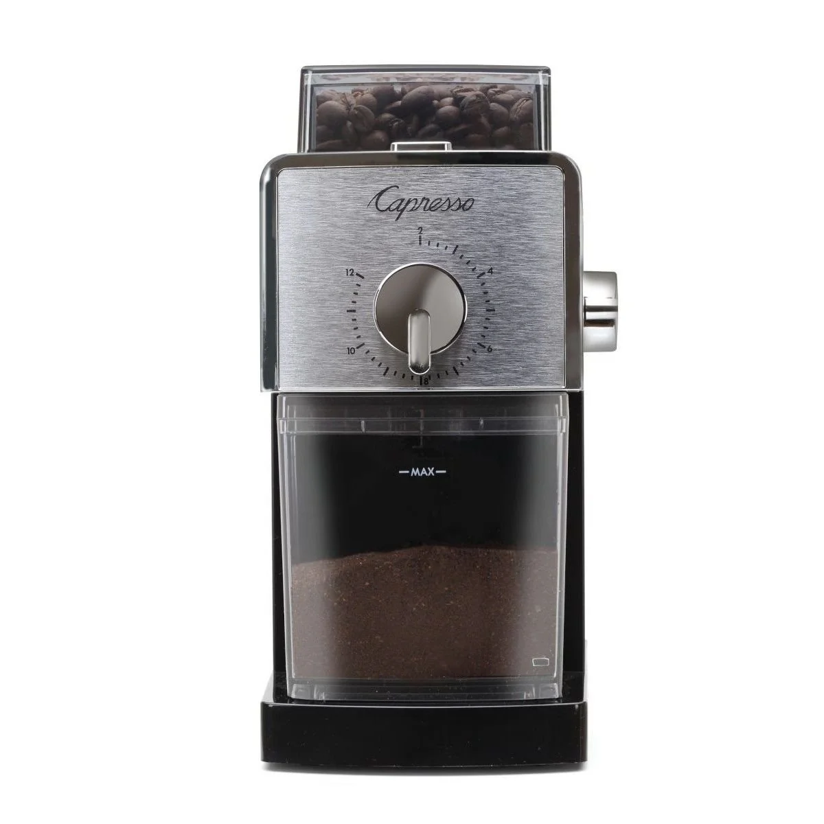 Enjoy the superior taste of coffee brewed from freshly ground beans with the Capresso Burr Coffee Grinder. This grinder holds up to 8oz of whole coffee beans and has 16 grind settings from fine to coarse to achieve your preferred brew strength. With a classic black and stainless steel design, this grinder can blend into any kitchen aesthetic. The durable steel disk burr is removable for easy cleaning and is dishwasher-safe. Whether you prefer a bold espresso to power through your work day or a sweet hazelnut to sip slowly on a Sunday morning, the Capresso Burr Coffee Grinder will give you the best quality brew every time!