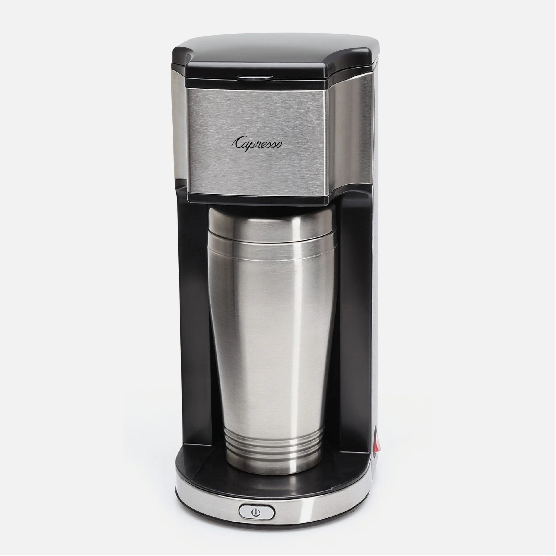 For busy and active people that crave that morning cup of coffee, Capresso offers the On the Go Personal Coffee Maker for quick brew service you can carry with you anywhere. The single cup coffee maker prepares a large 16 ounce beverage right directly into the stainless steel insulated travel mug included. You can get up, start the personal coffee maker, add your sweeteners and cream if you wish after the brewing is completed. Then you can be on your way to work, to run errands, or to do chores around the house. The travel mug helps eliminate spills, and keeps your coffee hot so much longer than traditional ceramic mugs. This versatile Capresso single serve coffee maker uses either soft coffee pouches and pods, or you can use ground beans using the removable permanent filter. The large shower head automatic brew style method is designed to saturate evenly and extract at the best rates possible. So get your coffee fix on with this Capresso On the Go Personal Coffee Maker for that wonderful, efficient, and so convenient beverage you desire!