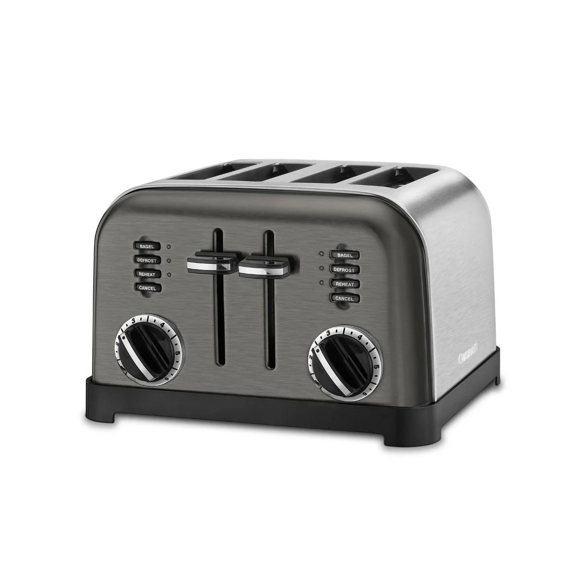 The Cuisinart 4-Slice Classic Metal Toaster in Black & Brushed Stainless Steel is perfect for feeding a large family and serving guests! This toaster has all the cooking abilities of two high-end toasters in a single convenient package. It even has two separate control panels, so everyone can be happy with their toast!