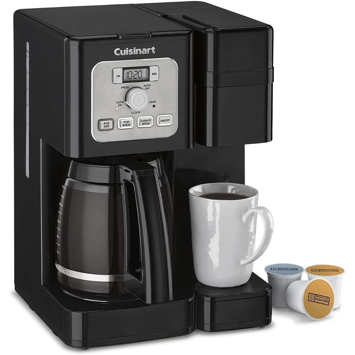 Whether you need to brew a 12-cup carafe for a gathering of family and friends or a single-serve pod for the morning commute, the Cuisinart Coffee Center Brew Basics coffeemaker gives you the flexibility to do both in one streamlined machine! The compact design takes up minimal countertop space and the modern black styling looks great in any kitchen. With a 64oz reservoir for drip brewing and a 40oz reservoir for single serve brewing, you can quickly make fresh coffee whether you need a cup or a carafe. Both reservoirs also include charcoal filters for the freshest taste. A bright LCD panel displays the programmable 24-hour clock as well as the Water Refill sensor. Programmable Auto Start and Stop enable you to have the freshest coffee available right when you need it.The Brew Pause feature lets you pause brewing to pour from the carafe, and the Keep-Warm base keeps the fresh-brewed pot warm for up to four hours. Single-serve brewer accepts most standard pods and can be adjusted for 8oz, 10oz, or 12oz output. Let the dual-function Cuisinart Coffee Center Brew Basics turn your countertop into your destination for fresh, delicious coffee at any time of the day