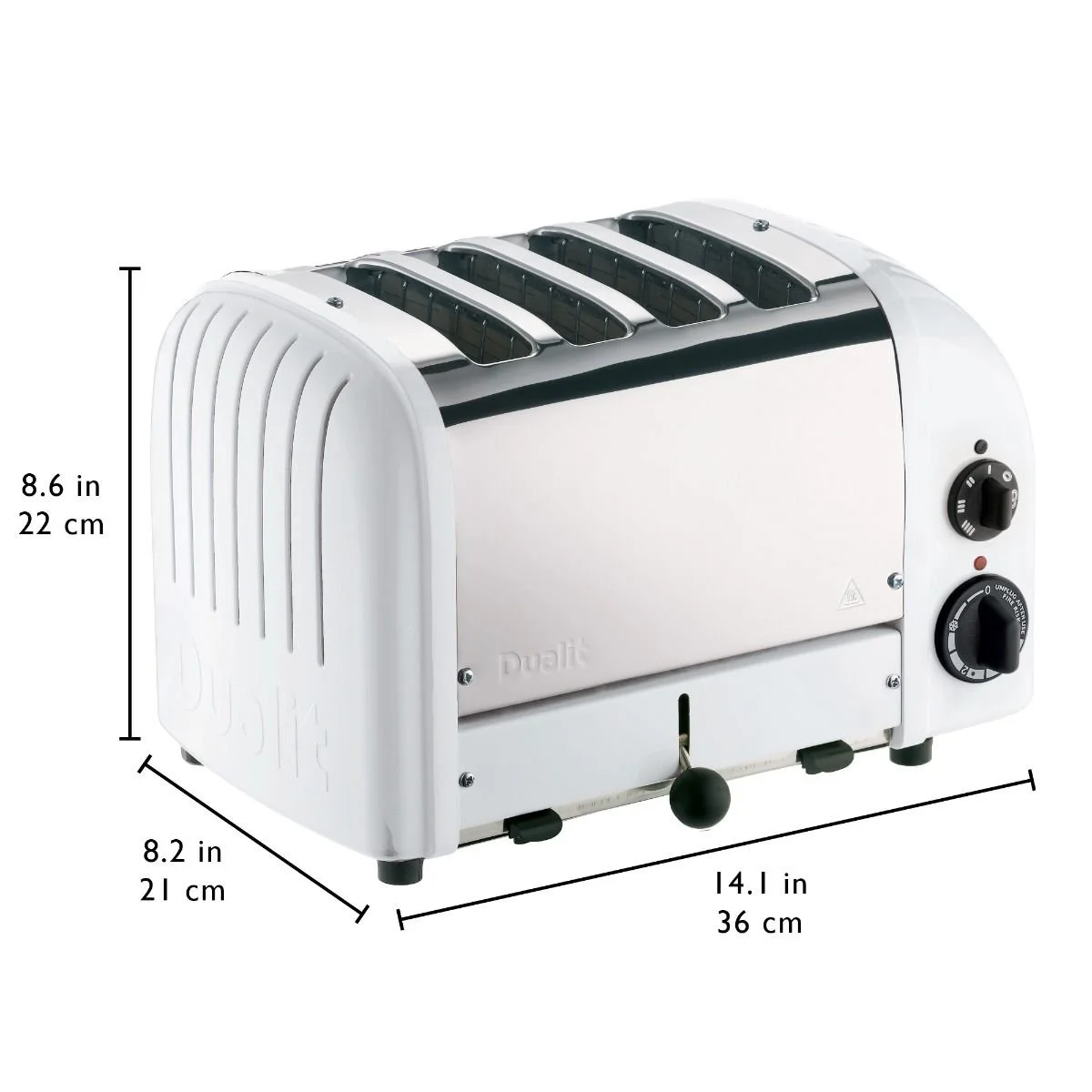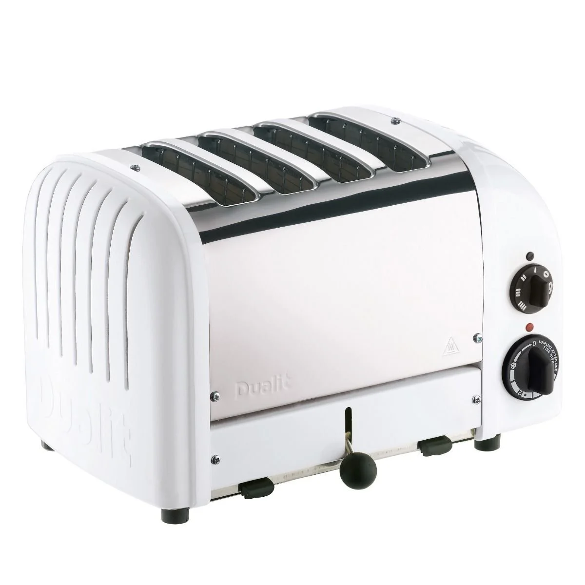 This White 4 Slice Toaster has the quality and style that you have come to expect from Dualit toasters. The ProHeat elements are an award winning Dualit patented design which increases toasting quality and longevity. With extra wide slots you can toast thicker breads, bagels, buns, or even sandwiches. This powerful and versatile toaster is designed for commercial use with the ability to toast up to 130 slices or bread per hour, but with the compact toaster design and bold, stylish stainless steel and White colors it is perfectly at home on you kitchen counter.