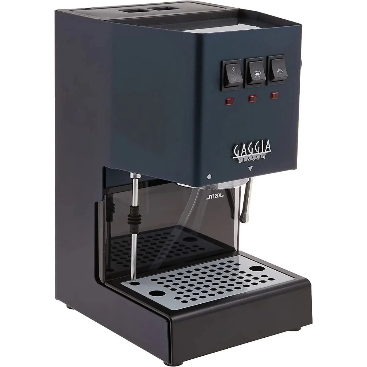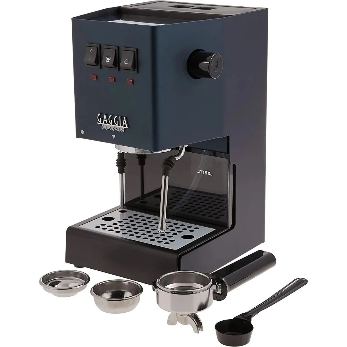 In a fast-paced world, getting high-quality espresso from your favorite coffee shop might get tricky on your way to work. But now you can have it made in your home before you leave with the Gaggia Classic Pro Espresso Machine in Classic Blue! This espresso machine is an upgrade from one of the best entry-level semi-automatic espresso machines on the market. Its updated frame and housing provide a streamlined look and better accessibility to the 72oz water reservoir. Simplistic in operation, the interface of the device features three switches for power, brewing, and steaming—each control has its own indicator light to let you know when the machine is powered up, ready to brew, and ready to steam. Using a 15-bar pump to provide the optimal pressure for espresso with authentic “crema natural,” it also houses a 3-way solenoid valve to relieve pressure off the coffee for a dry, easily discarded puck.
