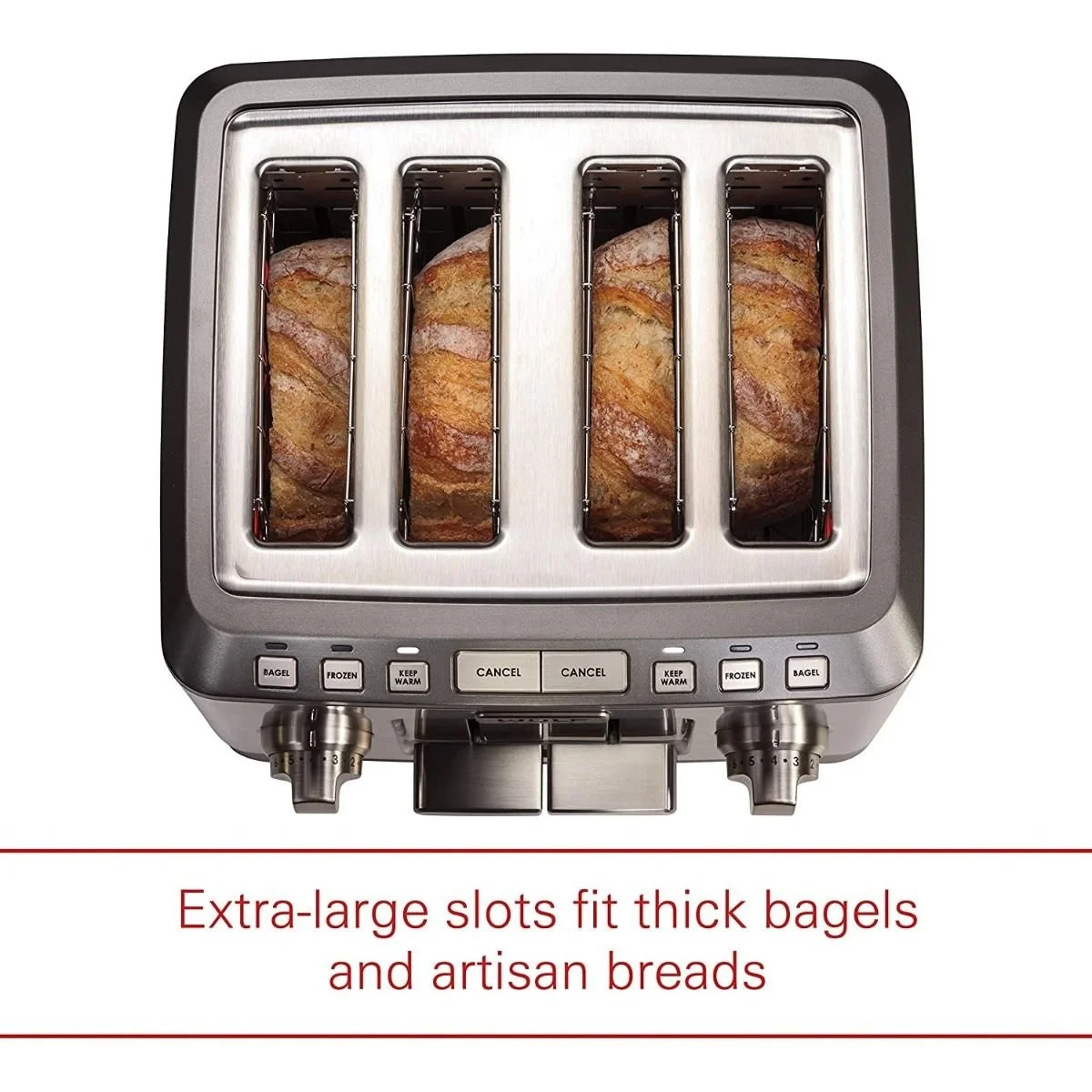 - Four-slice toaster with extra-wide bread slots